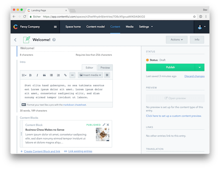 Contentful is beautiful and the UI is very intuitive. But it lacks one major feature which is important to me: repeatable grouped fields. Additionally, the pricing is just a bit too much in my opinion. I can’t expect my clients, who are used to get Wordpress “for free”, to pay $ 39 each month. You can read my article about building headless CMS powered Vue.js landing pages if you’re interested in building websites with Contentful.