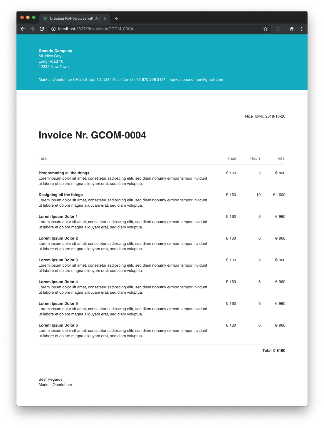 Next up, we can use the services, to fetch all the data we need for our Vue.js application to render an invoice. Below you can see the contents of the src/App.vue file of our application which is doing all the magic. You might want to split this up into multiple components, I decided against it because I feel it’s not large enough yet to sacrifice the convenience of having everything in one place for a clean and tidy application structure.