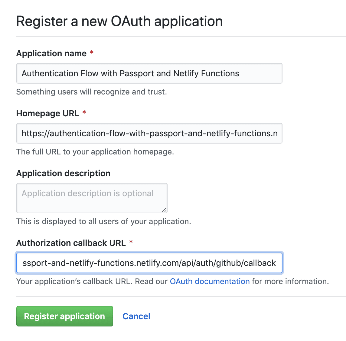 Above you can see that we set the callback URL of our application to /api/auth/github/callback. Keep in mind that you should create a separate OAuth application for your development environment, where you can set the correct authorization callback URL.