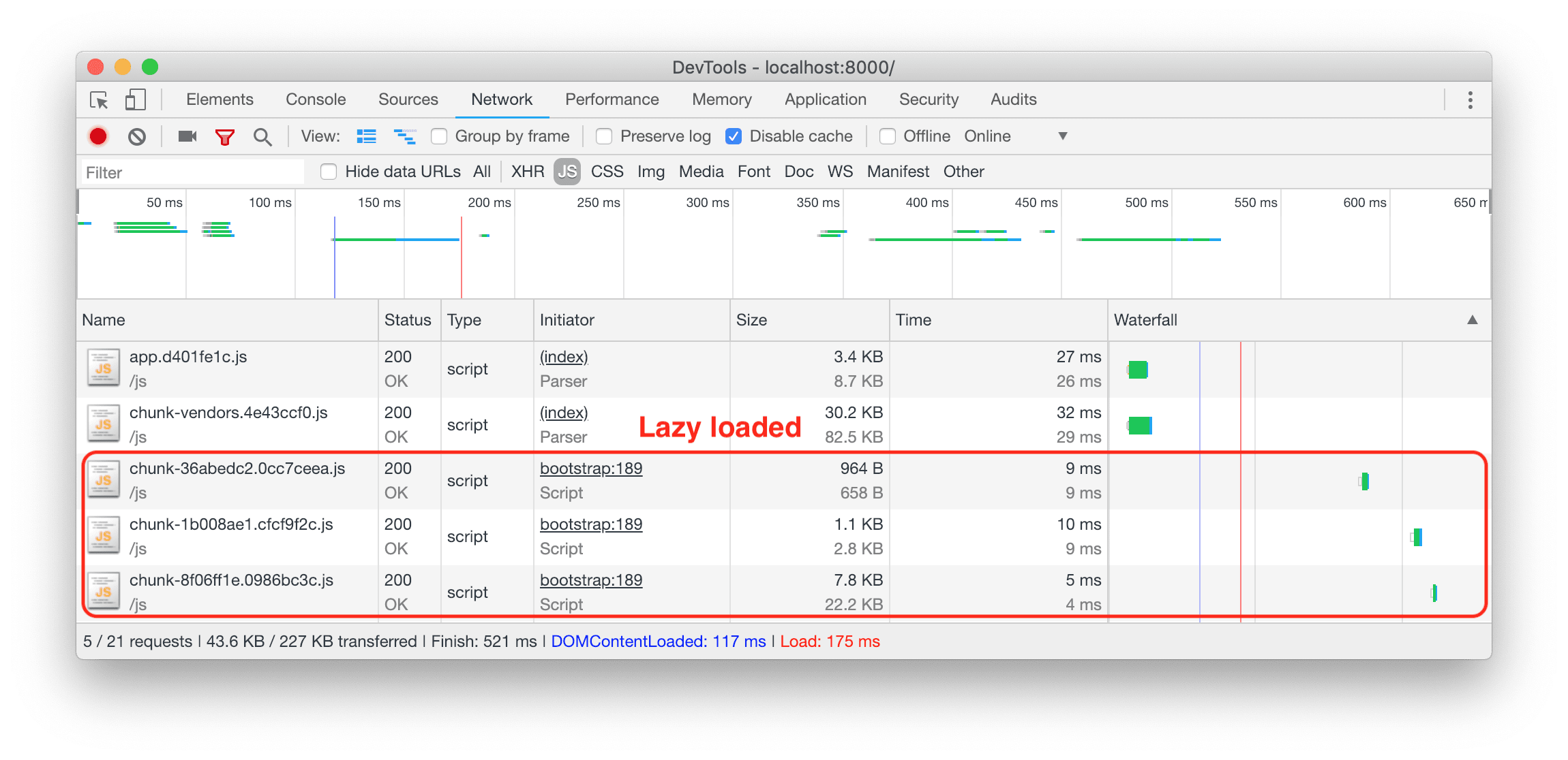 If we take a look at the network tab of our browser of choice, we can see that we can save 126 kb on the initial page load. To be fair, most of that (115 kb) is because of images, but we’re also able to shave off about a third of the JavaScript code needed to initially render the page. Considering that this is a very simple application with some very simple components, it’s still not too shabby.