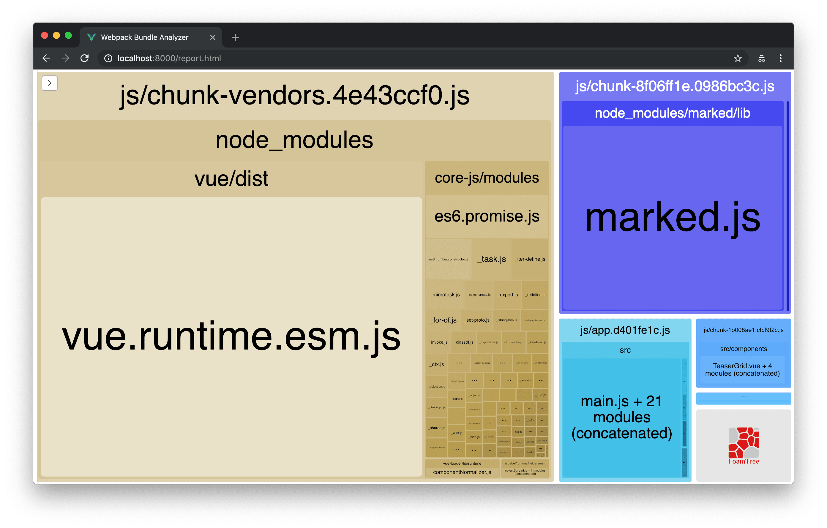 In the following screenshot you can see a graphical analysis of the bundles created by webpack. Particularly notable is the fact that the very heavy marked package is moved into a separate bundle with the component which uses it. This helps a lot in reducing the file size of the main bundles.