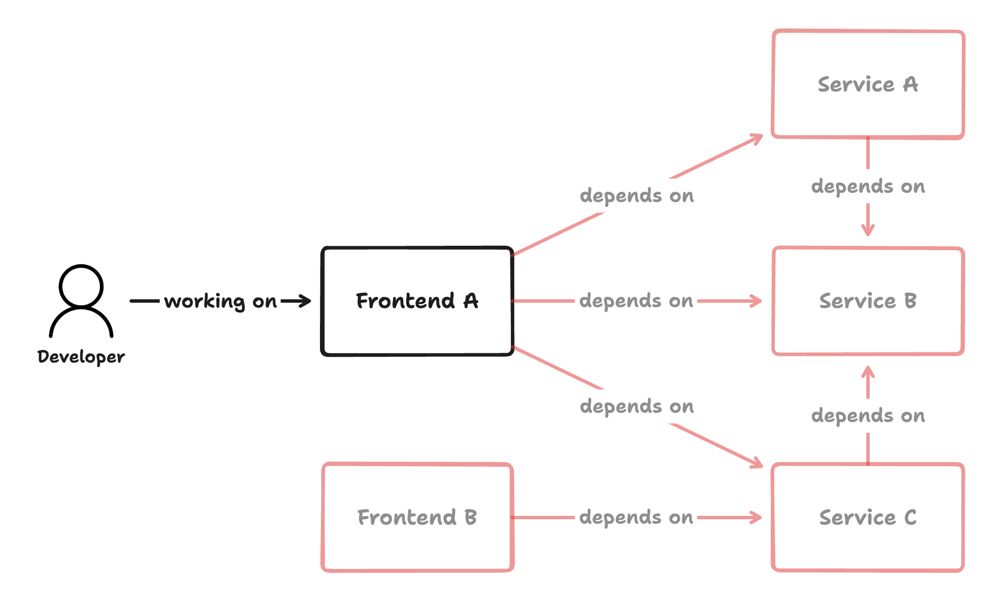 If you can’t work on your microservice or frontend locally without spinning up other services, you’re probably not getting many of the benefits you hoped for. You end up in a situation like the above graphic where, as a developer, you have to spin up the entire web of dependencies just to work on a tiny “micro”frontend. However, an effective microservice or frontend must be perfectly decoupled from other system pieces. Yet, it isn’t if you can’t run it locally without spinning up any other services.
