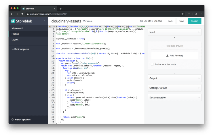 It is important to name your new custom field type plugin cloudinary-assets, otherwise it won’t work correctly. Next you can see the Storyblok plugin editor. Replace the demo code with the contents of dist/export.js. After publishing your newly created plugin, you’re able to select it as the custom type of your fields.