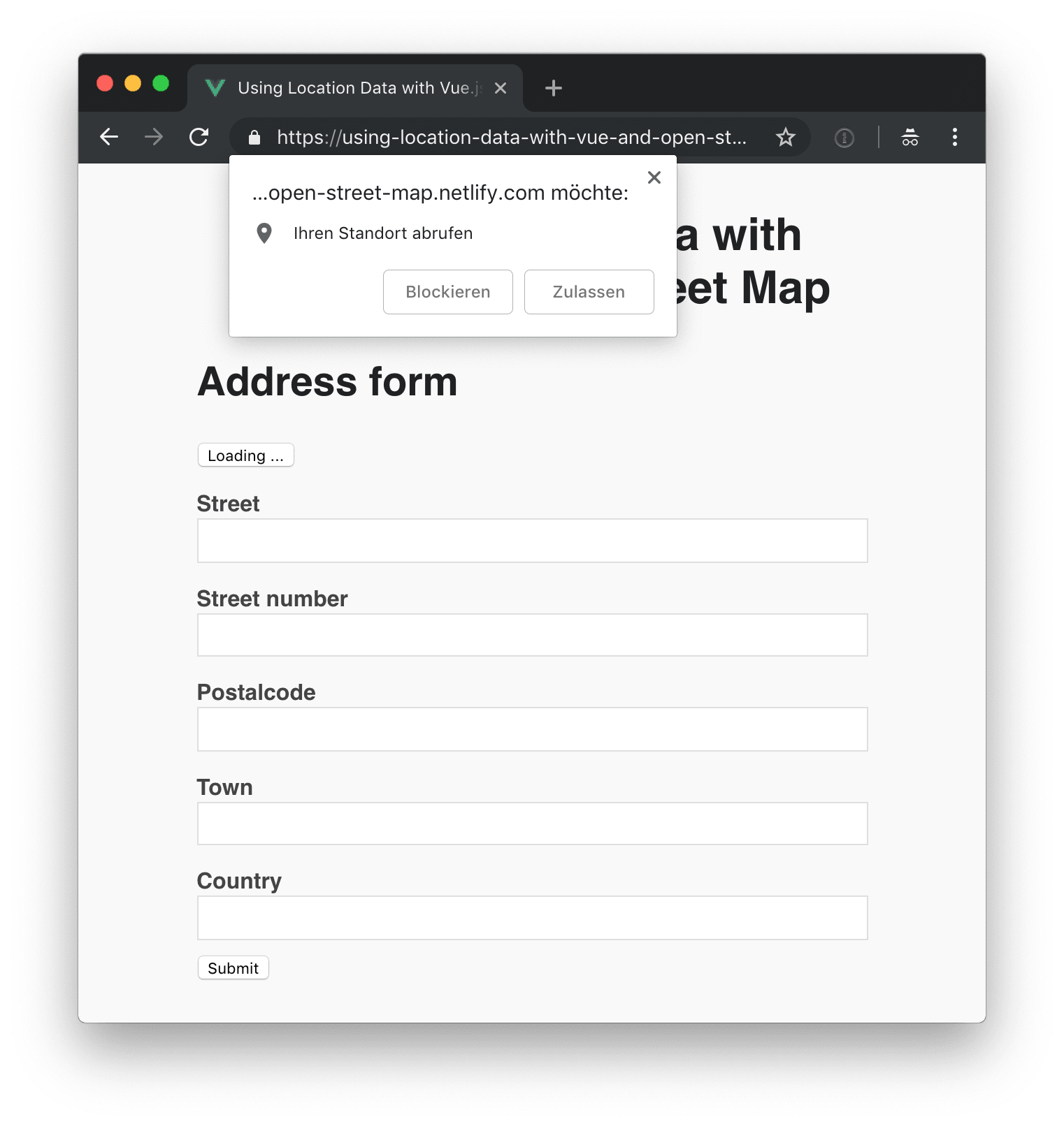 Today we’ll explore how we can use the native browser geolocation API and the Open Street Map API to handle location data in a Vue.js applications. In our example app the users can press a button to automatically enter their address data into a form by allowing the geolocation API to access their current location.